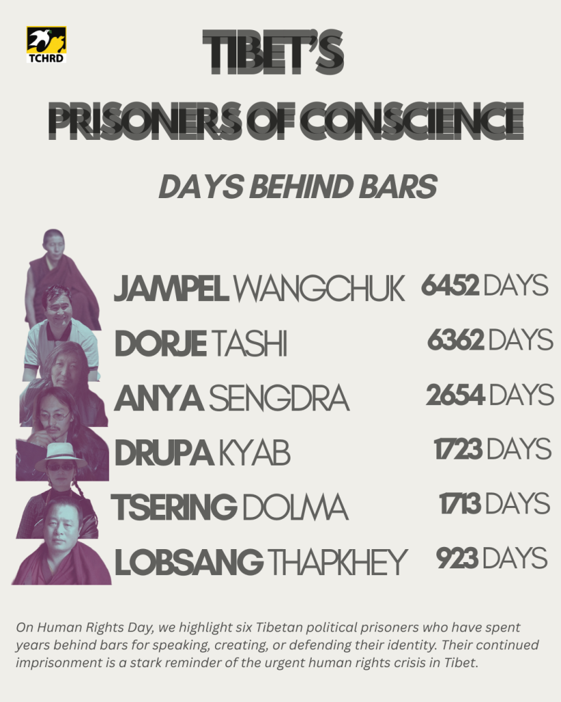 In honor of this year’s Human Rights Day, beginning 11 December, the Tibetan Centre for Human Rights and Democracy (TCHRD) will highlight six Tibetan human rights defenders who remain imprisoned for exercising their most basic rights, many of them spending lengthy prison terms, some even life in prison. By telling their stories, we aim to honor their courage, remember their sacrifices, and call for their immediate and unconditional release.