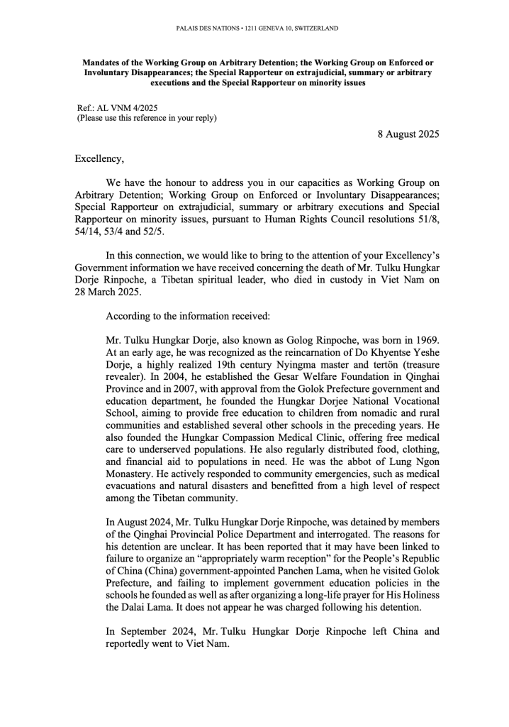 A group of UN human rights experts issued a joint communication (AL VNM 4/2025) to the Vietnamese government demanding clarity and accountability over the detention, disappearance, and subsequent death in custody of Tulku Hungkar Dorje, a prominent Tibetan spiritual leader and the abbot of the Lung Ngon Thubten Choekor Ling monastery in Gade (Ch: Gande) county in the Golok (Ch: Guoluo) Tibetan Autonomous Prefecture of Qinghai province.